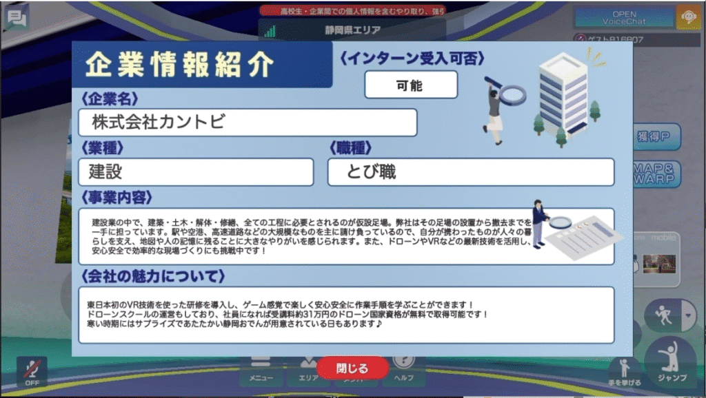 「ジョブドラフト~メタバースFes~」にカントビのブースが登場しました! メタバースFesとは、全国の高校生が時間や場所を問わず企業の情報を見ることができる、新しい形の合同企業説明会です! 全国の企業情報をいつでも見ることができるので、就職先を決める際の参考にしてみて下さい😊 2026年3月末まで公開しているので、期間中に是非お越しください✨